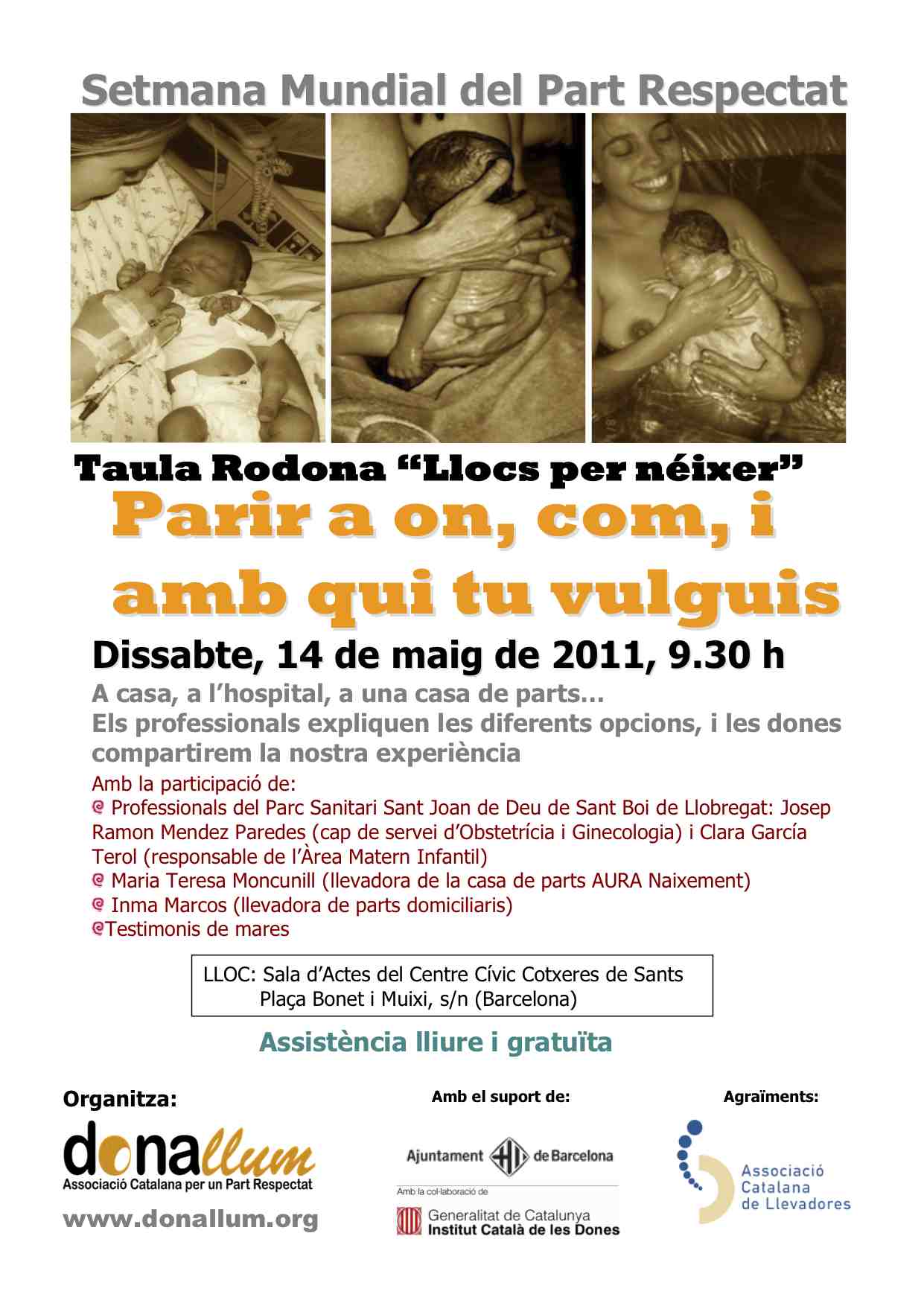 Este año, la Semana Mundial del Parto Respetado, que este año tendrá lugar entre el 15 y el 22 de mayo, tiene por lema «Parir donde quieras, de la manera que quieras y acompañada de quien quieras». En este contexto, Dona Llum, la asociación catalana por el parto respetado, organiza una mesa redonda «Lugares para nacer» que tendrá lugar en Barcelona el próximo 14 de mayo de 2011, de 9.30h a 14 h en el Centro Cívico Cotxeres de Sants (Plaza Bonet i Muixi, s/n).